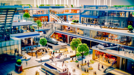 Vibrant shopping mall scene with escalators linking diverse stores and customers exploring brands