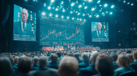 Vibrant trade show scene in modern convention hall with engaging exhibits and dynamic atmosphere