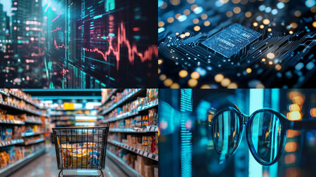 A dynamic collage of four futuristic technology images, featuring city lights, a microchip, stock market data, and a grocery cart, representing modern innovation and digital life.