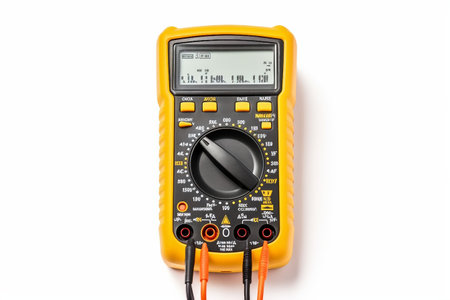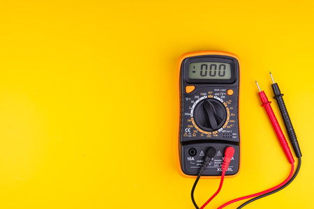 Yellow digital multimeter with probes on white background