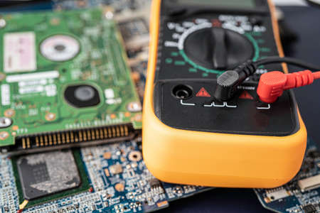 Close-up of digital multimeter on wooden background, Worker used electronic tools for checked circuit, Special tools on electronic job.