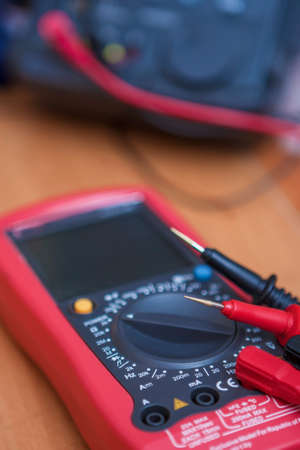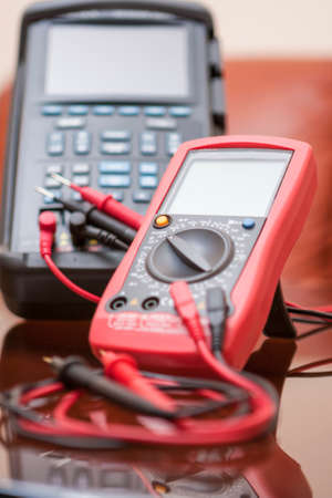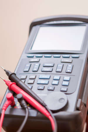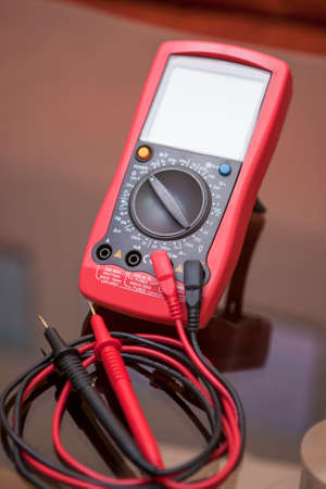 Electronic multimeter with wires on a table. Electrical equipment.