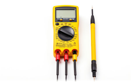 yellow multimeter with black and red probs focus on the probs isolated on white
