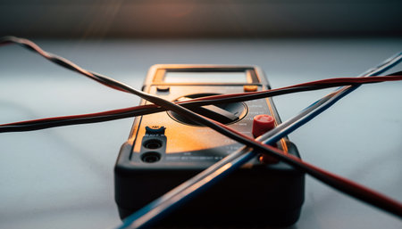 Digital multimeter with the connected probes on a table in a workshop