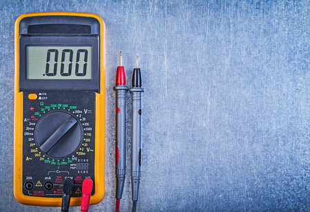 Digital electric tester on metallic surface copy space.