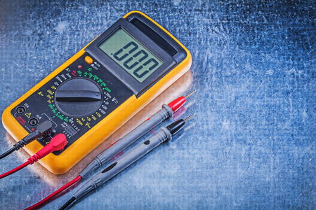 Digital electrical tester on metallic surface directly above electricity concept.