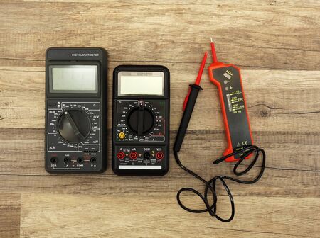 Multimeter measuring device electric tool for measurement of voltage lying on wooden floor background