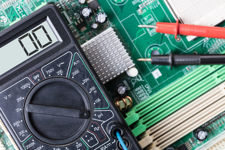 Checking the electrical resistance of the motherboard. Hands using a digital multimeter to test. View from above. Selective focus. Close-up
