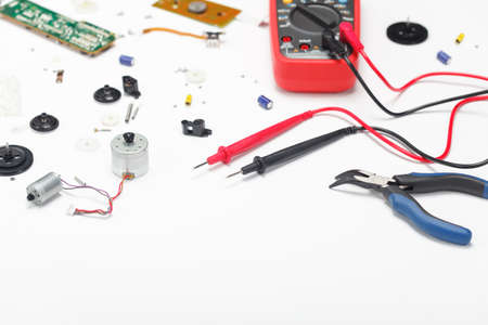 Engineering mess background with multimeter, electrical and mechanical parts. View above. Empty space