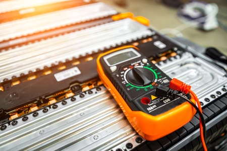 the multimeter is lying on the battery of an electric car on a blurry background.
