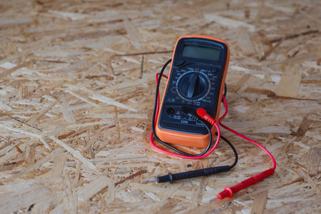 Orange and black digital multimeter with red and black test leads placed on oriented strand board OSB construction material