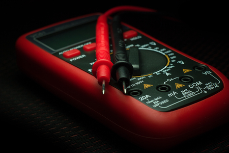Red multimeter, multimeter or multitester, modern multifunctional voltage measuring instrument on dark background