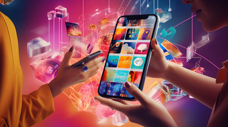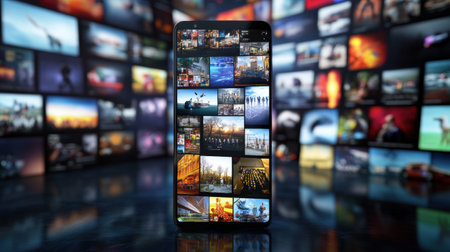 Smartphone displays a vibrant array of multimedia content, showcasing images from various categories in a contemporary environment filled with technology.