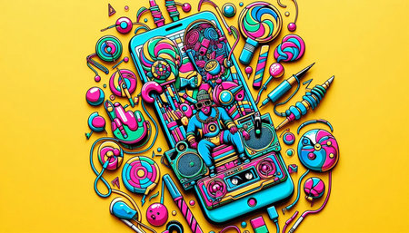 A bold and colorful illustration featuring a punk-style man with a mobile music recorder in vibrant candy tones.