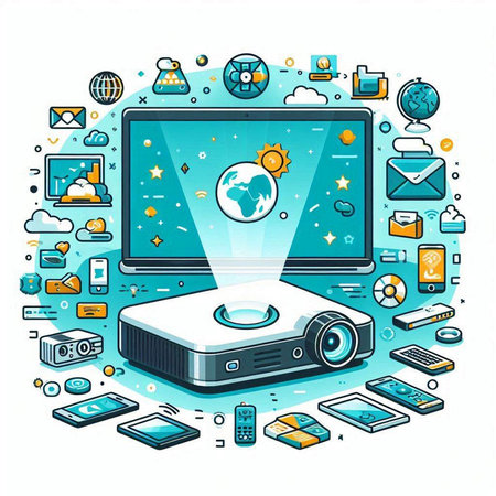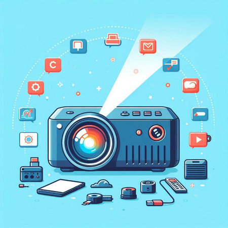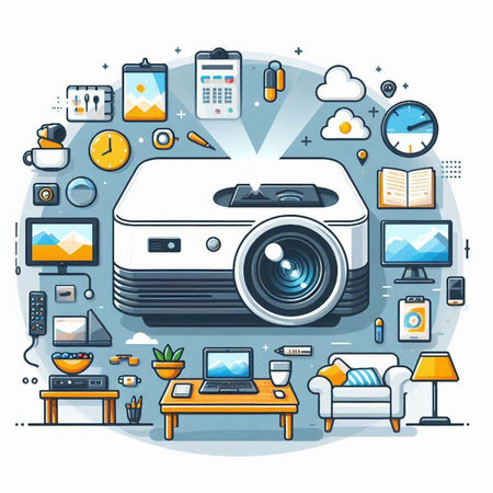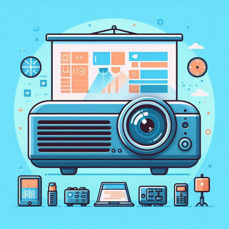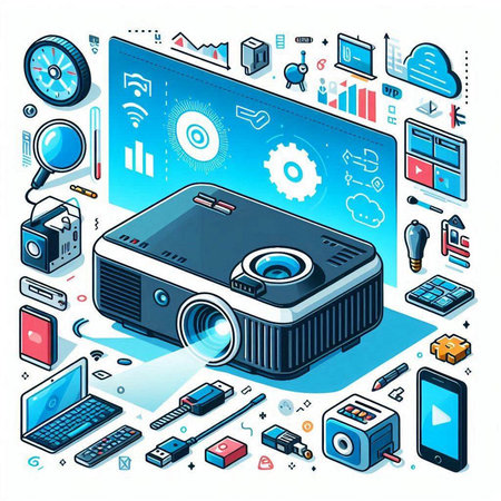 Vector isometric 3d illustration of a projector on the background of gadgets.