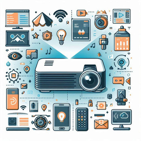 A sleek modern projector rests on a table, featuring a glowing lens and vibrant lighting. Ideal for showcasing technology and design in cinematic settings.