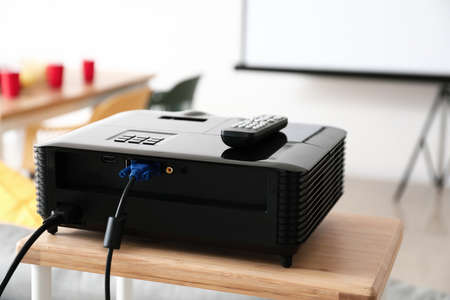 Modern video projector on table, closeup