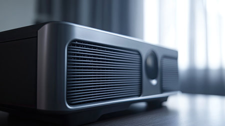 A sleek and modern home projector showcased on a stylish table in a bright living room, perfect for movie nights or presentations in a cozy setting.