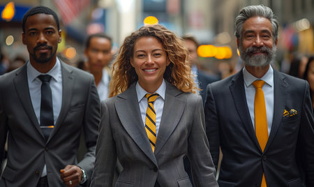 A team of interracial business people in suits walking among business buildings in urban city