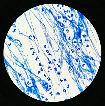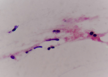 Branching budding yeast cells with pseudohyphae in sputum gram stain fine with microscope.