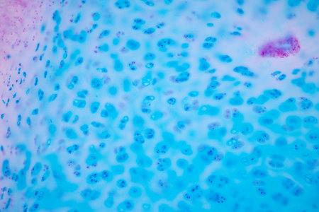 Human hyaline cartilage bone under microscope view for education pathology. Human tissue.