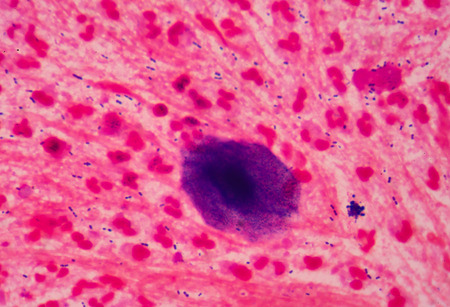 Mycobacterium tuberculosis positive (small red rod) in sputum smear, acid-fast stain, analyze by microscope 1000x