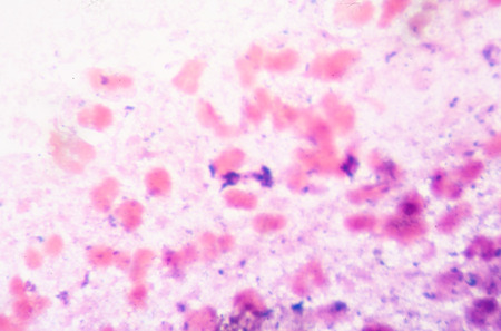 Smear of Acid-Fast bacilli AFB stained with WBC and mucous, under 100X light microscope.