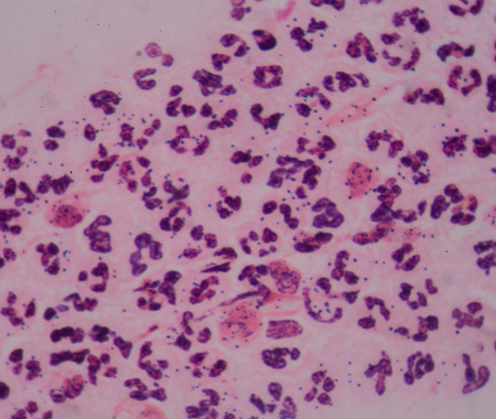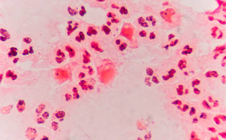 Moderate red white blood cells with gram negative diplococci intracellular Gram-negative coffee bean-shaped diplococci bacteria responsible for the sexually transmitted infection gonorrhea