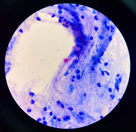 Multinucleated cell in Tzanck test finding with microscope in laboratory.