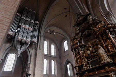 TRIER, GERMANY - Apr 20, 2025: Interior Trier Cathedral grand pipe organ suspended arches carved altar filled intricate figures. Daylight monumental architecture sacred artistic craftsmanship