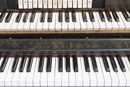 Close up old vintage manual double keyboard (bank of keys) of church organ, high angle view