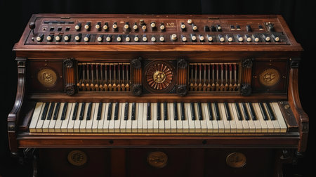 Close up view of a vintage organ showcasing detailed keys and ornate knobs emphasizing the craftsmanship and musical heritage of the instrument.