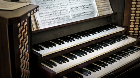 Vienna, Austria - May 12, 2019 Close up view of a church pipe organ with four keyboards. Piano keyboards in four raw. Professional music instrument.