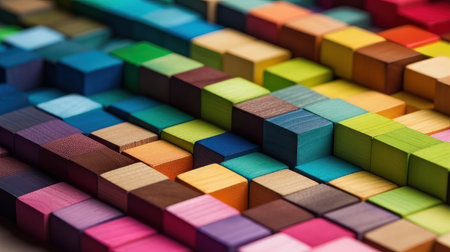 A spectrum of colorful wooden blocks, stacked together, forms a dynamic backdrop representing creativity, diversity, expansion, growth, and depth. Generative AI.