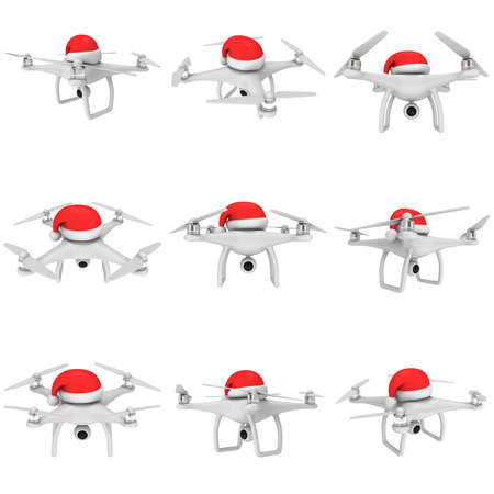 Remote control air drone set. Dron flying with action video camera and christmas hat. 3d render illustration on white