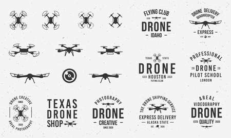 Collection of Drone logos, emblems, labels, badges. Set of 9 logo templates and 10 design elements for logo design. Drone business. Vector templates