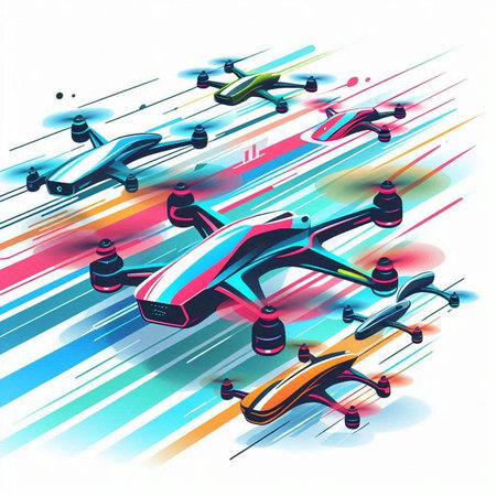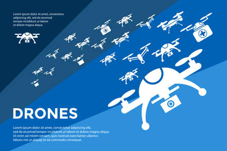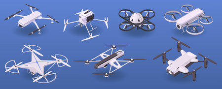 Various drones displayed in isometric design, floating on a blue background, symbolizing technology and innovation. Vector illustration