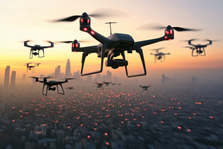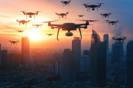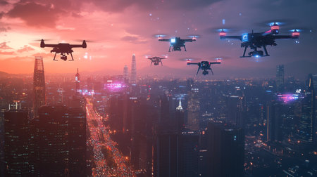 Drones are soaring above a bustling city as the sun sets, casting warm colors across the skyline.