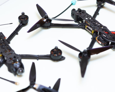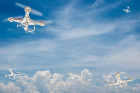 Drones fly over the fields. Natural landscape with drones and quadrocopters flying over it.