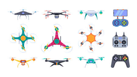 Digital vector flying drone objects color simple flat icon set collection, isolated