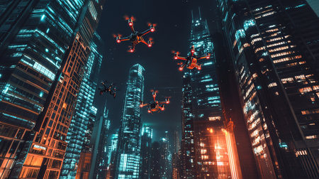 Drones navigate the skyline at sunset, illuminating the city below with their lights as evening sets in.