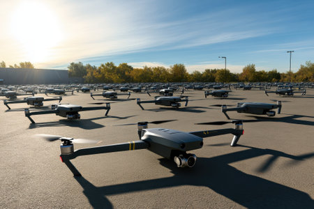 A multitude of drones hover in the sky during sunset, capturing the beauty of a technology-laden landscape.