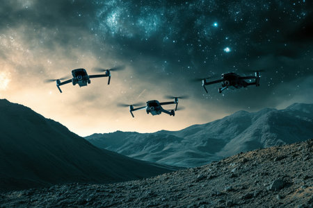 Three drones navigate above rugged mountains while a stunning night sky sparkles with stars.