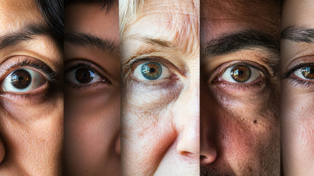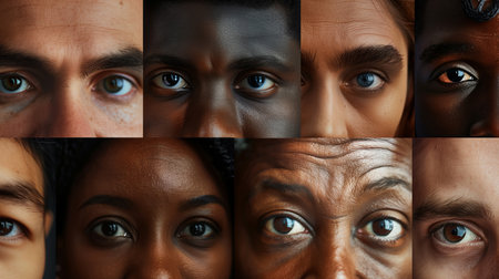 This image presents a montage of various human eyes, each representing a unique individual and different ethnicities. The composition features diverse skin tones and eye colors, creating a striking visual contrast. Soft lighting highlights textures and details. Ideal for illustrating themes of diversity, identity, and the beauty of human variety.