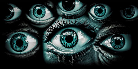 multitude eyes emerge darkness fixed and watchful creating surreal and intriguing contrast stark white backdrop.