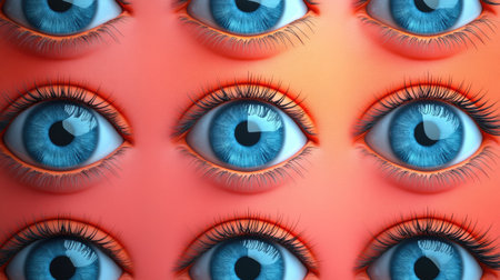 Multiple artificial eyes with eyelashes on a red background, surreal photography concept