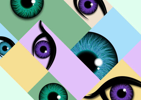 Creative collage made with human eyes of different people, men and women of diverse nationality, with colorful blank spaces