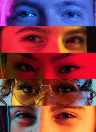 Neon stripes, loines. Closeup human eyes on multicolored background in neon light. Collage made of cropped faces of male and female models. Diversity