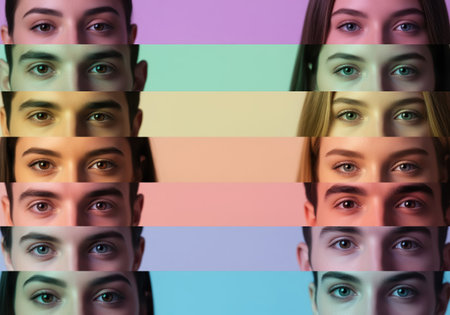 A striking graphic collage features multiple human eyes and upper faces arranged in horizontal stripes, set against a vibrant multicolor background, creating a diverse representation