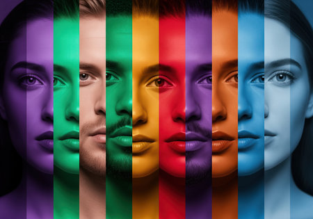 A striking composite portrait of diverse human faces, each sectioned by bold, vibrant vertical color stripes, highlighting individuality and variety within humanity